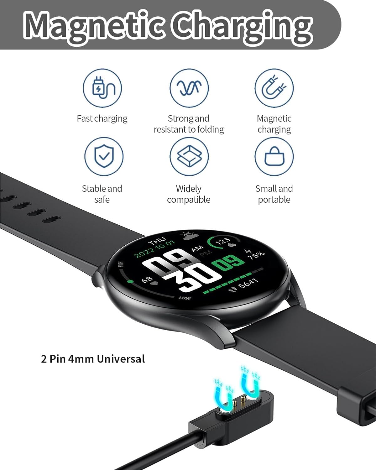 Universal Compatibility – Magnetic charge cable for smart watch Power up a wide range of smartwatches with this versatile 2-pin 4mm magnetic charger, Charge cable for smart watch compatible with Dafit/Nerunsa/Radley/Reflex Active/Acclafit/YAMAY SW022/Ticwatch GTX/Haylou Solar LS05/IMILAB KW66/Haylou RT LS05S/Haylou RT2 LS10/Haylou RS4 LS12/Haylou RS4 Plus/Haylou RS4 LS16/Lenovo S2 Pro/Lenovo 4G/GPTEK LW11/dido (E8, E8S, E50S Pro, E55, E55s pro, E56S Max, E59S, Y20S Pro, E10, E10s, E39S Pro, E23, E35, E48S, E48S Pro, E400, E500, Y60, Y60 Pro) and more. Perfect as a reliable replacement or backup charger.