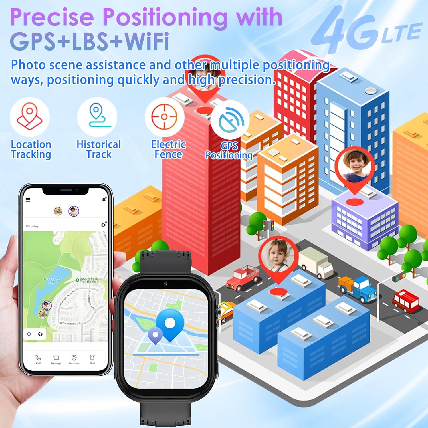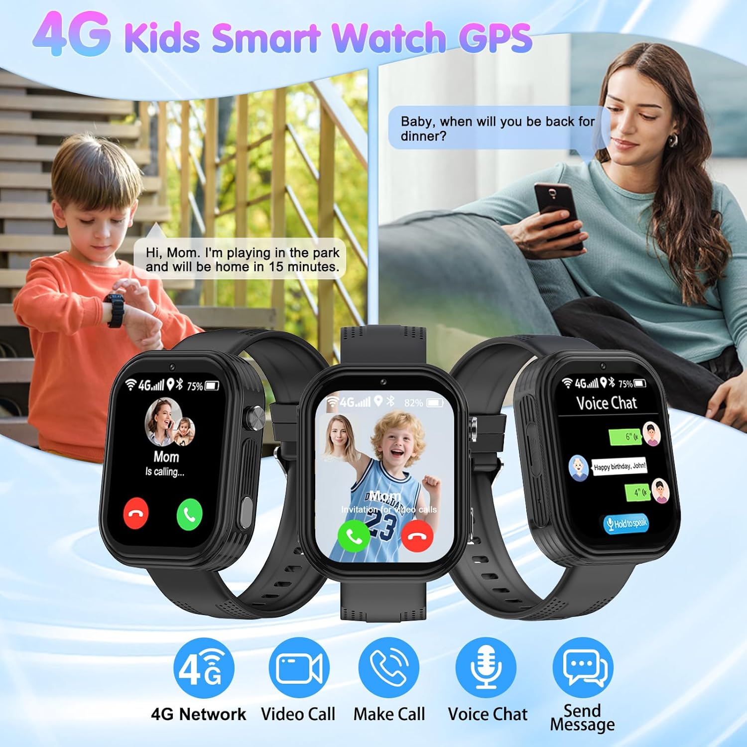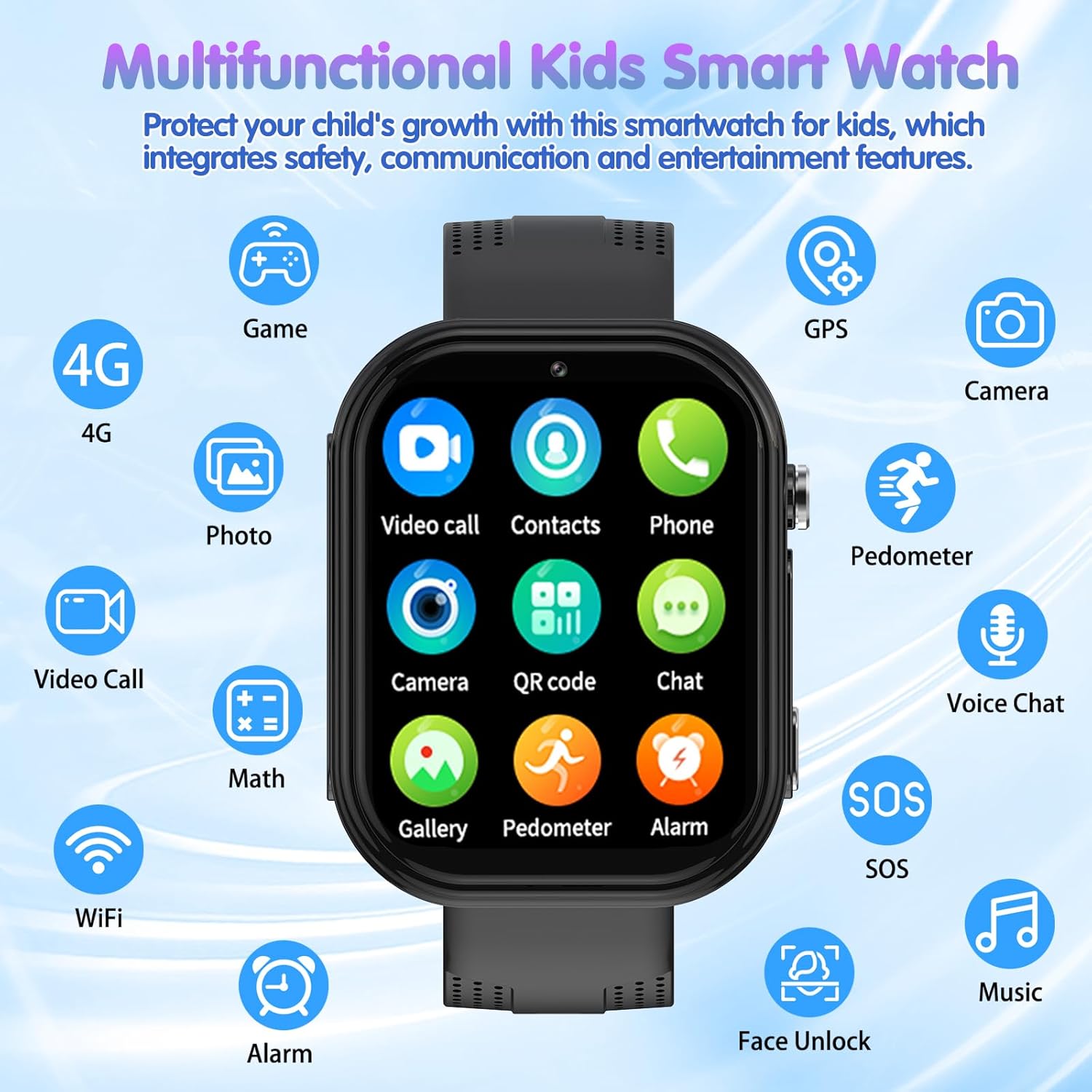 Kids Smart Watch 4G: Kids smart watch functions: HD video calling, GPS tracker, WIFI, voice chat, family group chat, phone book, camera, gallery, music, timetable, SOS, sport app, math game,etc. This smart watch for kids is as functional as your mobile phone! As a birthday gift and Christmas gift, it is an ideal gift for boys girls aged 6-13