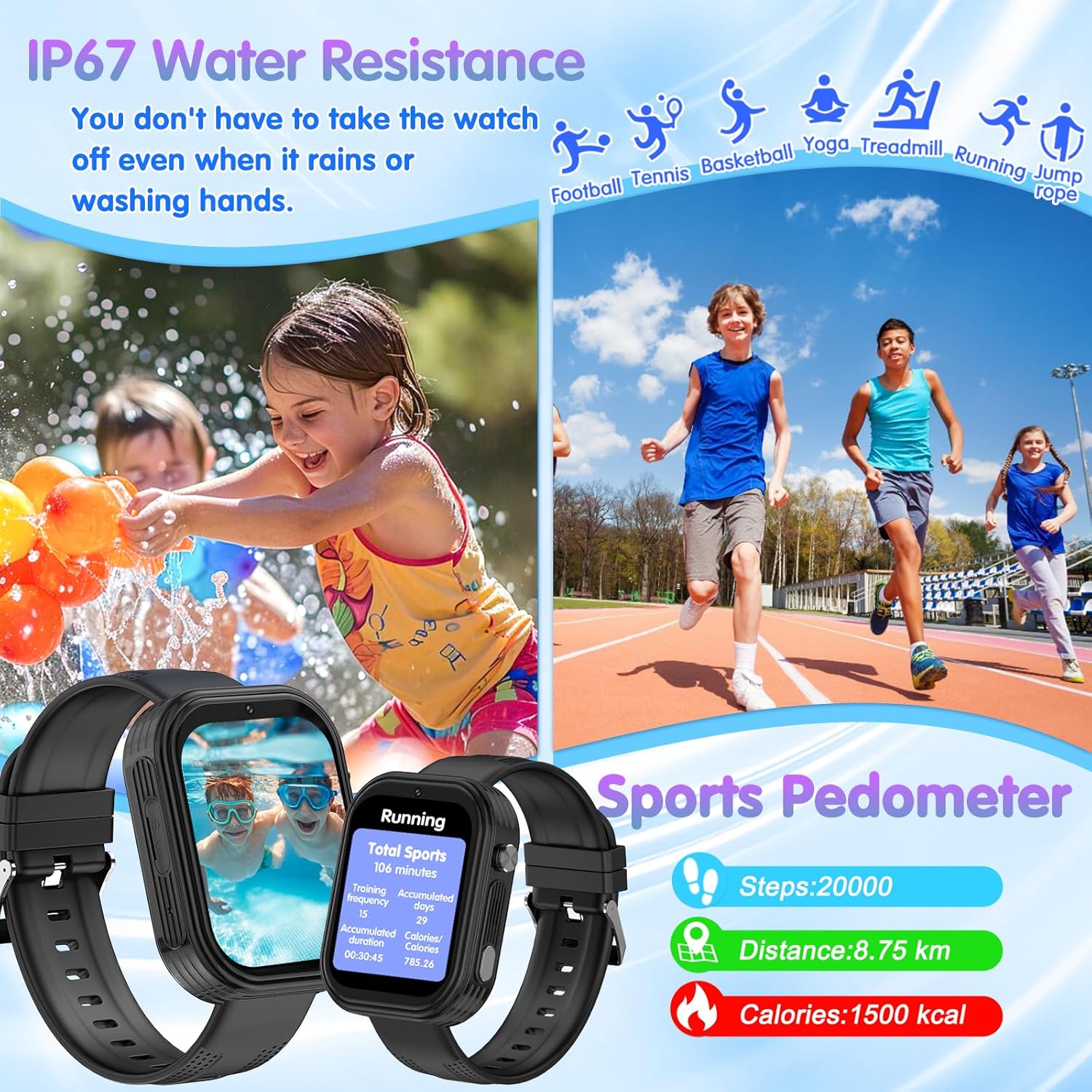 One-button SOS Emergency Call: Preset up to three SOS numbers for emergency calls. In an emergency, child can press and hold the SOS button for over 3 seconds. The kids smart watch will then dial and send messages to the 3 preset emergency contacts until someone answers. The stored contacts are automatically informed of the child’s location. Smart watch for kids with SOS function is ideal for emergencies