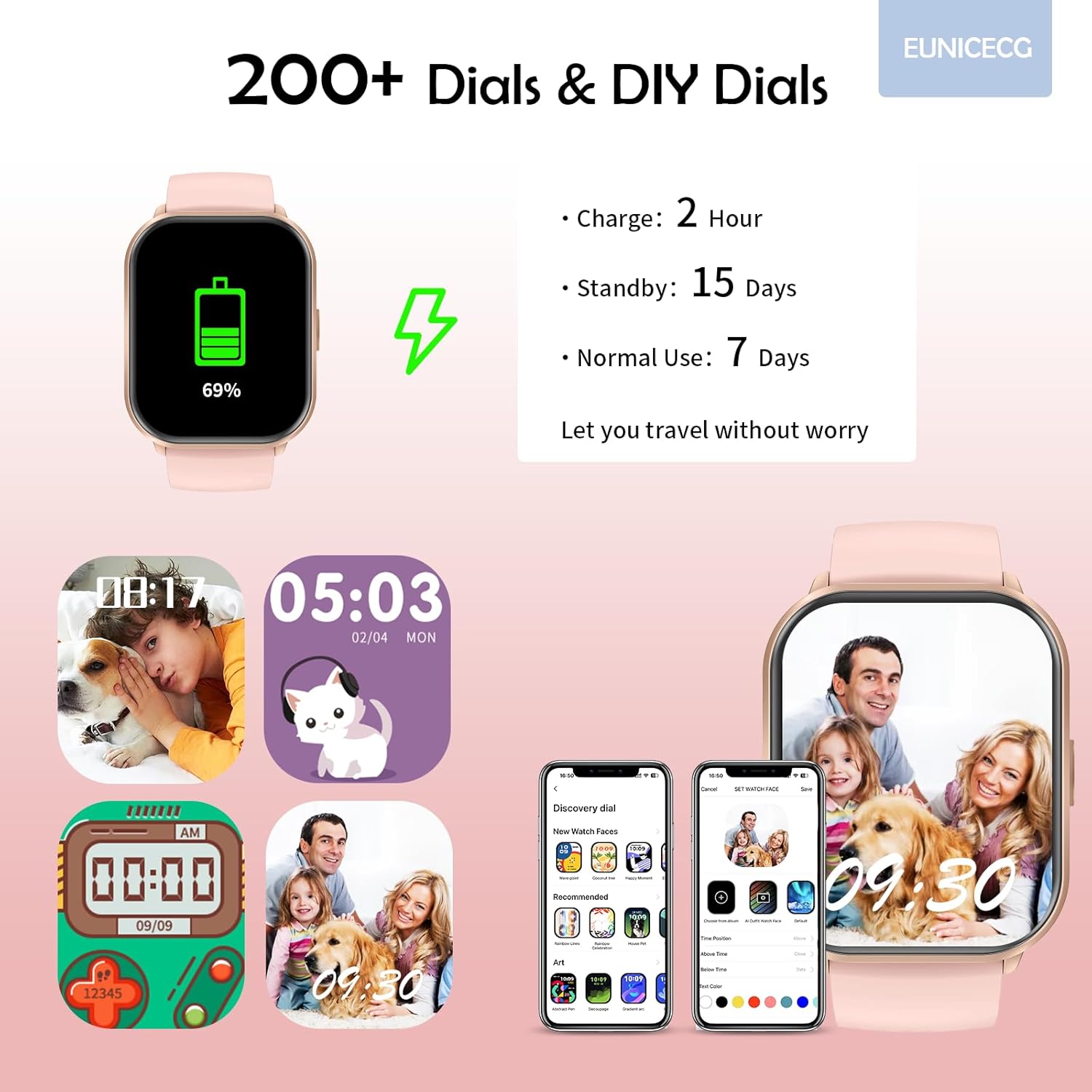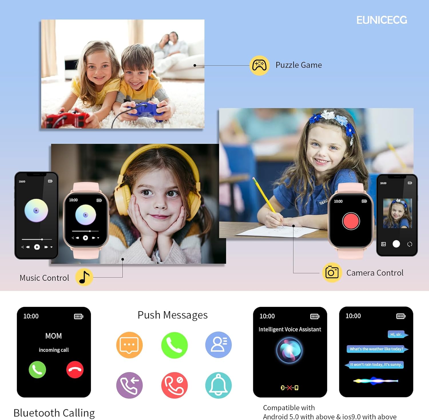EUNICECG kids smart watch comes with 2. 01-inch HD colour eye-care touch screen, all-day activity trackers , pedometer , calories, exercise distance, exercise time, more than 100 exercise modes, multiple online fitness classes and meditation exercise workouts, more than 200 customizable and cute dials, all-day health monitoring (heart rate, sleep, stress, blood oxygen, blood pressure), puzzles and games , alarm clock , Calculator, Countdown, Stopwatch, Flip Wrist, Sedentary Reminder, Drinking Water Reminder, Weather, Music, Photo, Bluetooth Calling, Message Alert, AI Voice Assistant, Brightness Adjustment, 13 Languages, IP68 Water Resistant and more. This is a full-featured kids smart watch to meet your child’s daily activity needs, perfect gift for boys, girls and teens for Birthday/New Year/Christmas/All Festivals.