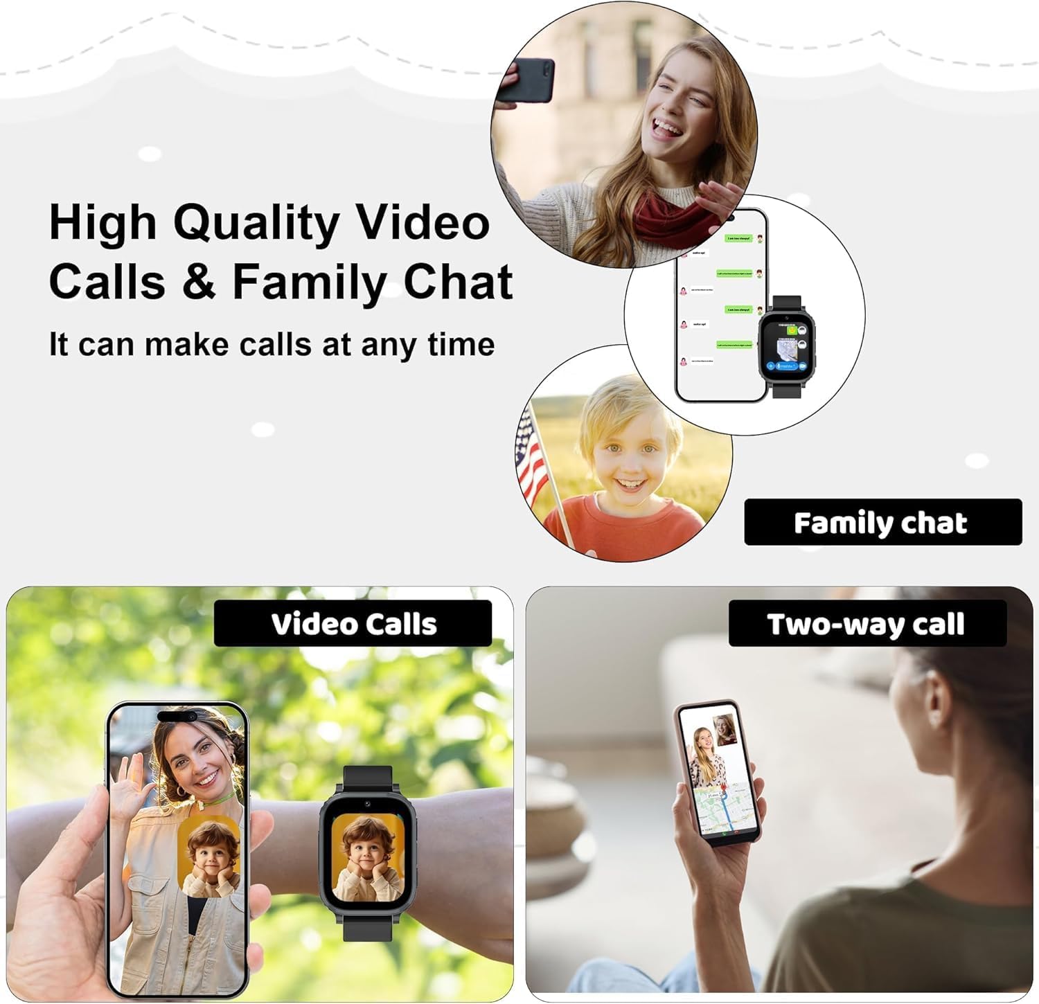 【Multi-function GPS Kids Smart Watch】Kids smartwatch 4g gps features video call, family voice chat, SOS, torch, school mode, GPS positioning, calculator, calendar, passcode lock, alarm clock, timer, photos, games and multi-language. HD screen and anti-blue light for more clarity and protect children’s eyes from damage, Silicone band is easy to clean. Smart watch for kids boys girls is the perfect Christmas birthday gift for kids aged 4 to 15 years old