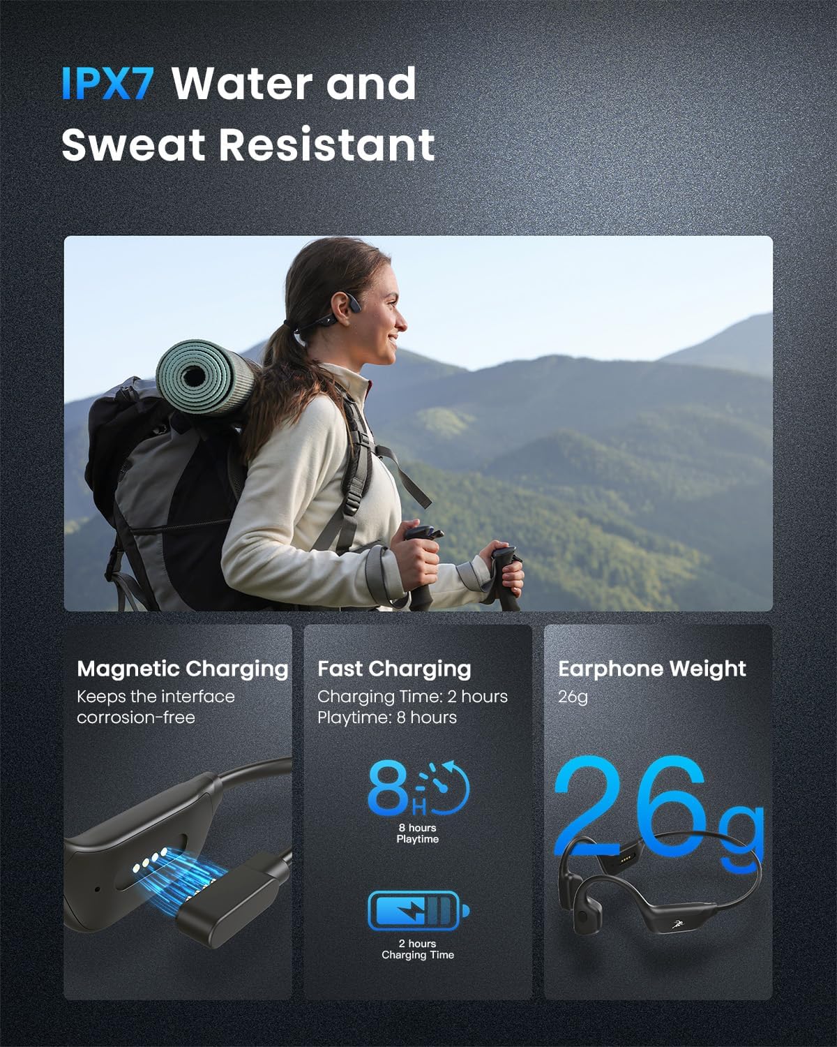 IPX7 Waterproof for All-Weather Use:Built to handle sweat, rain and splashes, our bone conduction headphones feature an IPX7 waterproof rating. Whether you’re running in the rain, cycling through wet conditions or powering through an intense gym session, they stay protected and reliable. Designed for active lifestyles, they let you focus on your workout without worrying about moisture damage