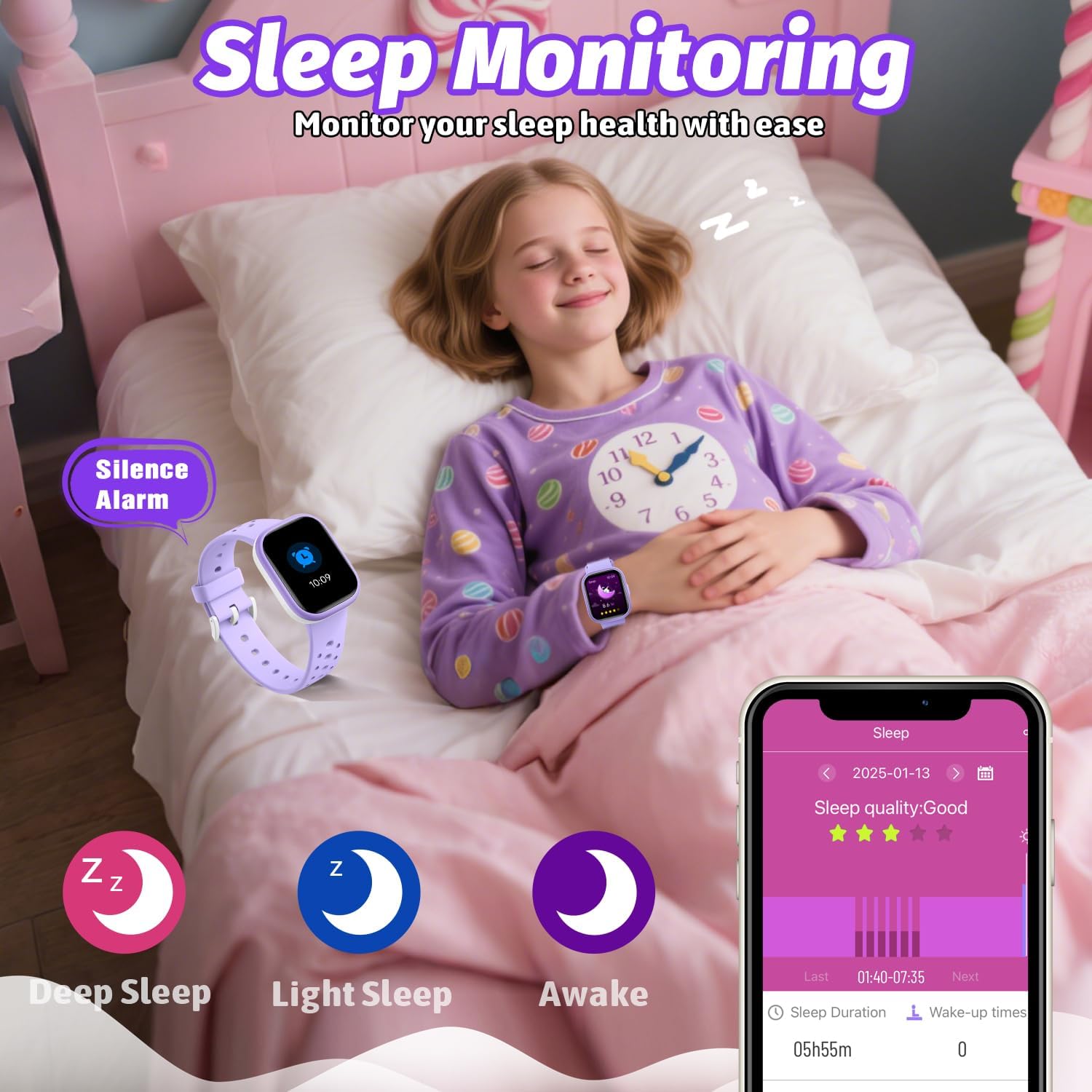 Sleep Tracking & Heart Rate: Adjust lifestyle reasonably,provide comprehensive analysis of kids sleep quality (deep sleep,light sleep and wake up time) to help kids develop a healthier lifestyle. (NOTE:The measurement data is for reference only and cannot be used as medical monitoring data)