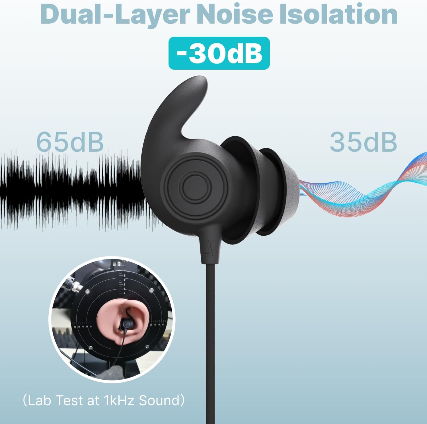 【Noise Isolation Sleep Headphones】The sleeping headphones feature 2-layer silicone earplugs in a snug fit oval shape, the ergonomic 45° tip will keep the earbuds stay firmly, providing dual noise reduction of up to -30dB (tested by lab), regain healthy adequate sound sleep by cutting out snoring, teeth grinding, sleep-talking and unpleasant noise.