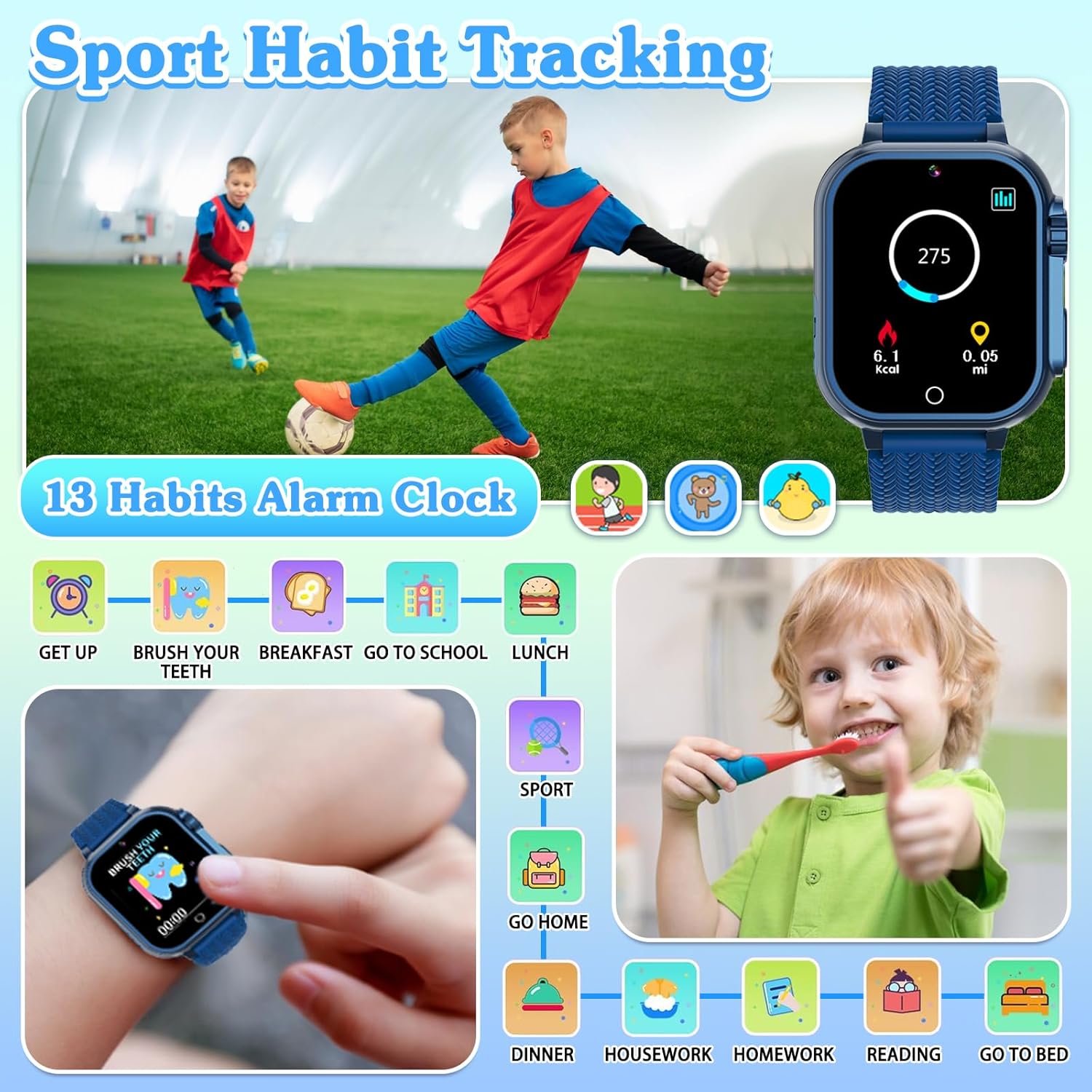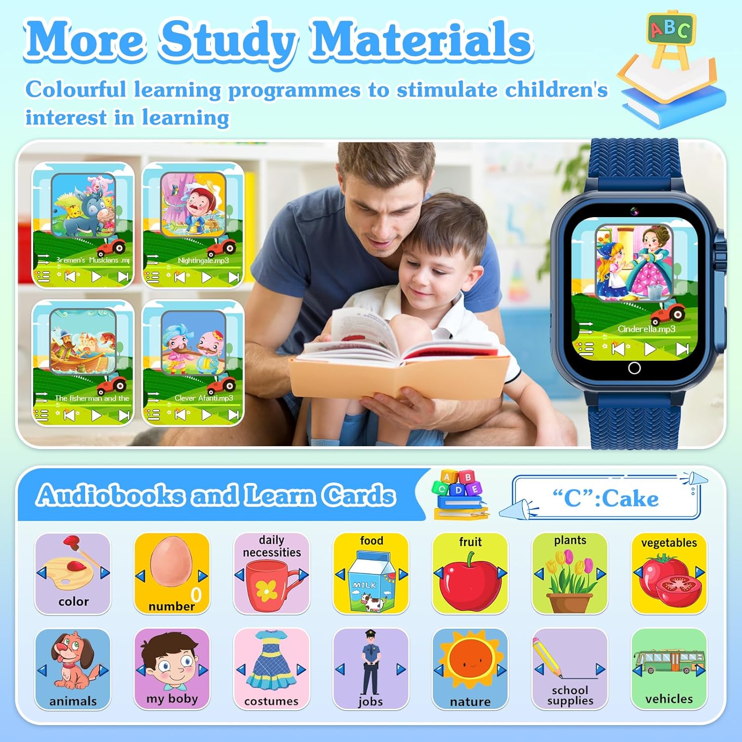 Upgraded Multi-functional Kids Smart Watch: Our kids smart watch has rich and exciting features, such as selfie camera, 13 habit tracker, pedometer, torch, time tool, alarm clock, calculator, calendar, parental control, 32 games, MP3 player, video recorder, audio recorder, etc. We also specially add sports APP, 100+ interactive learn cards and 10 audio stories Functions. Entertainment, education and sports are seamlessly integrated, which can bring convenience and fun to kids’ life