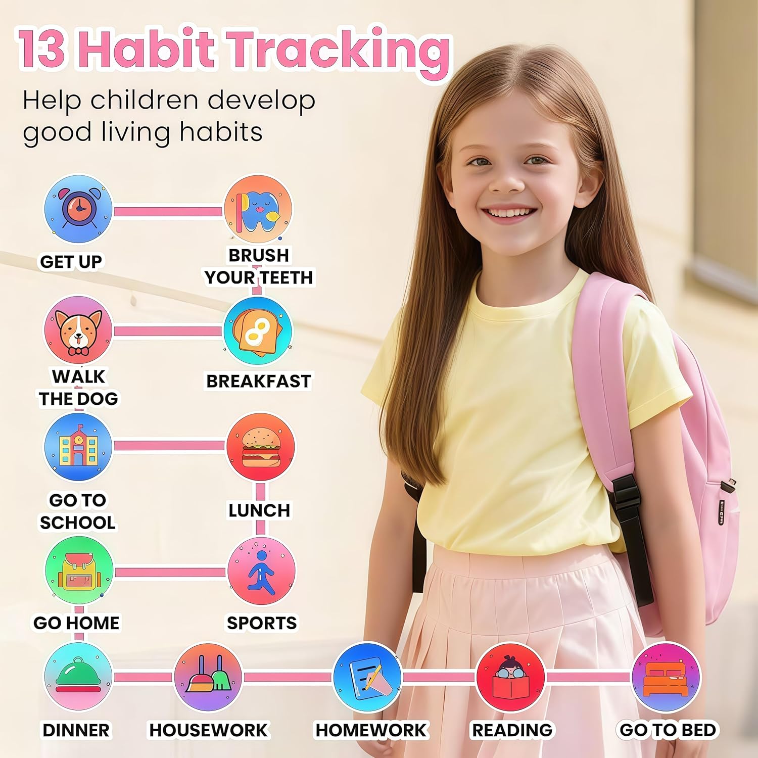 The kid smart watch includes 13 alarms for tracking habits (wake up/brush teeth/breakfast/walk the dog/school/lunch/exercise/home/dinner/chores/homework/reading/sleeping etc.) to help children adopt a disciplined lifestyle