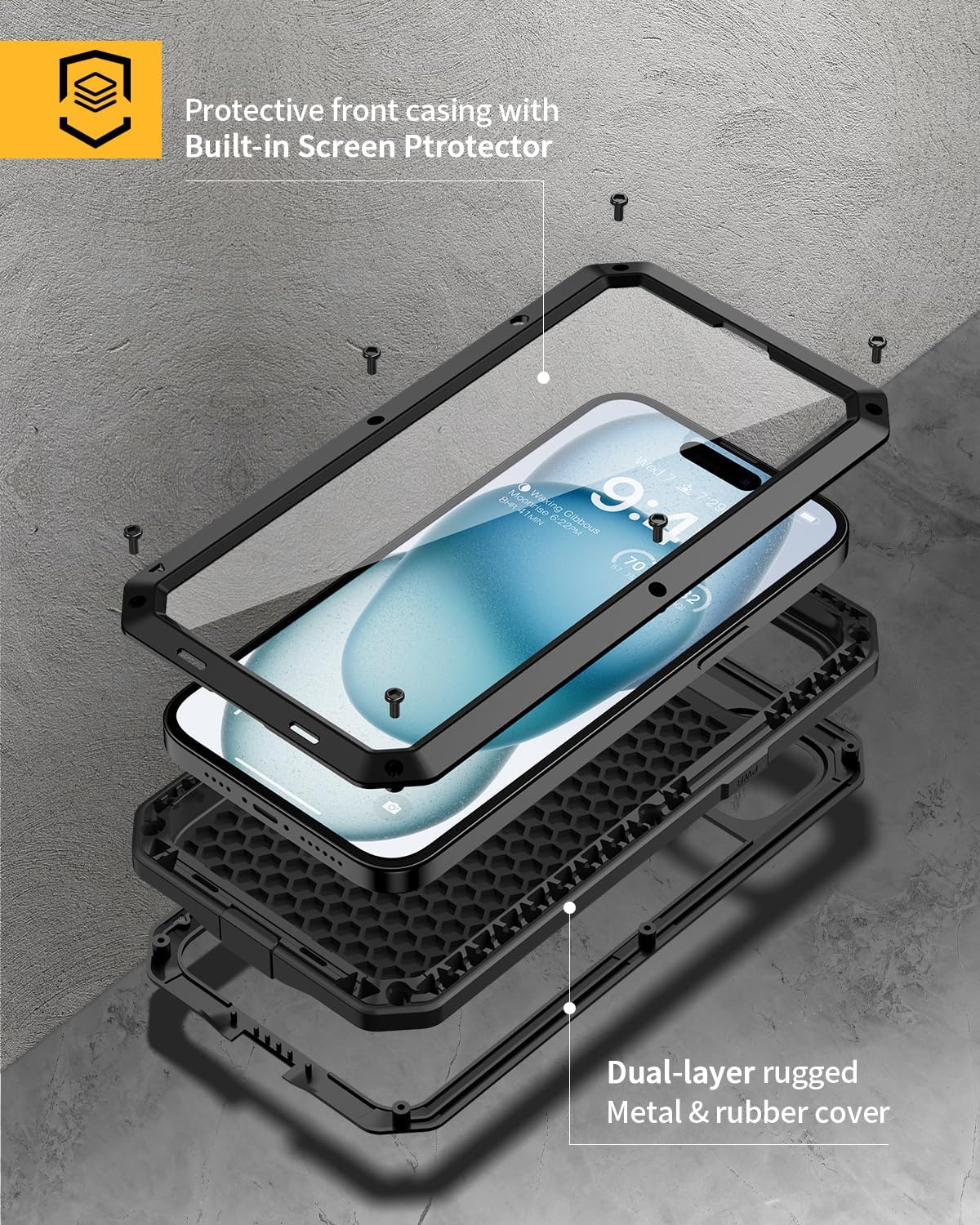 Lanhiem for iPhone 15 Case Heavy Duty Shockproof Cover Tough Armour Metal Case with [Tempered Glass …