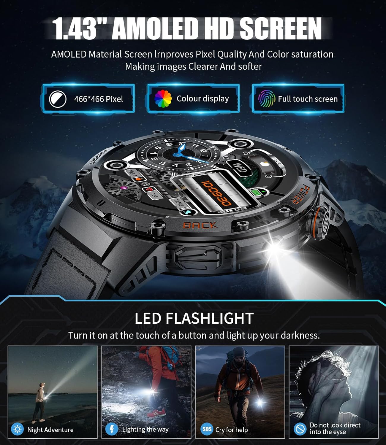 🔋【1.43″ AMOLED Display & 600 mAh Long Battery Life】 This tactical smart watches for men is its stunning 1.43 inch AMOLED display with resolution of 466 x 466 pixels, screen provides vibrant colors, sharp details, and deep contrasts which always display and concern with screen that remains clear and readable, even under direct sunlight. Boasting a powerful 600mAh battery, it provides up to 30 days of standby time and 5-10 days of active use. This means you can enjoy all the features without the constant need to recharge. Whether you’re traveling, hiking, or simply on the go, the long battery life ensures your amoled smart watch is always ready when you are.