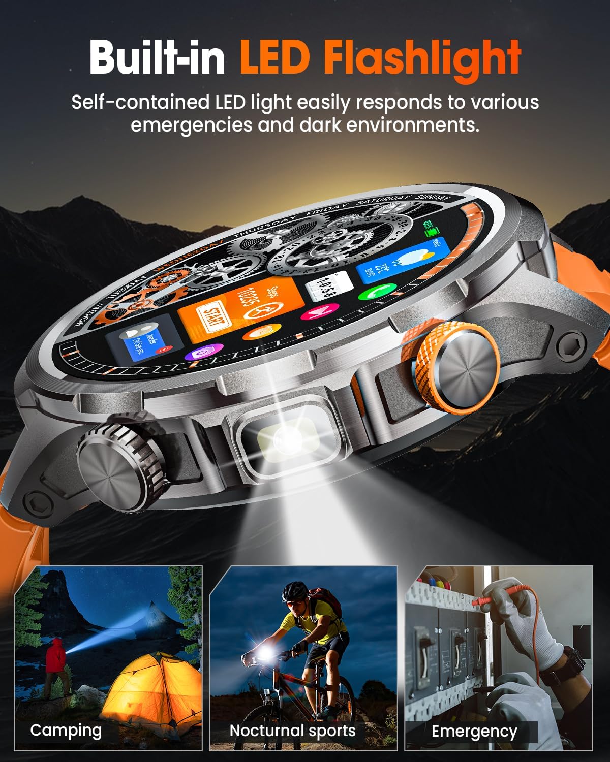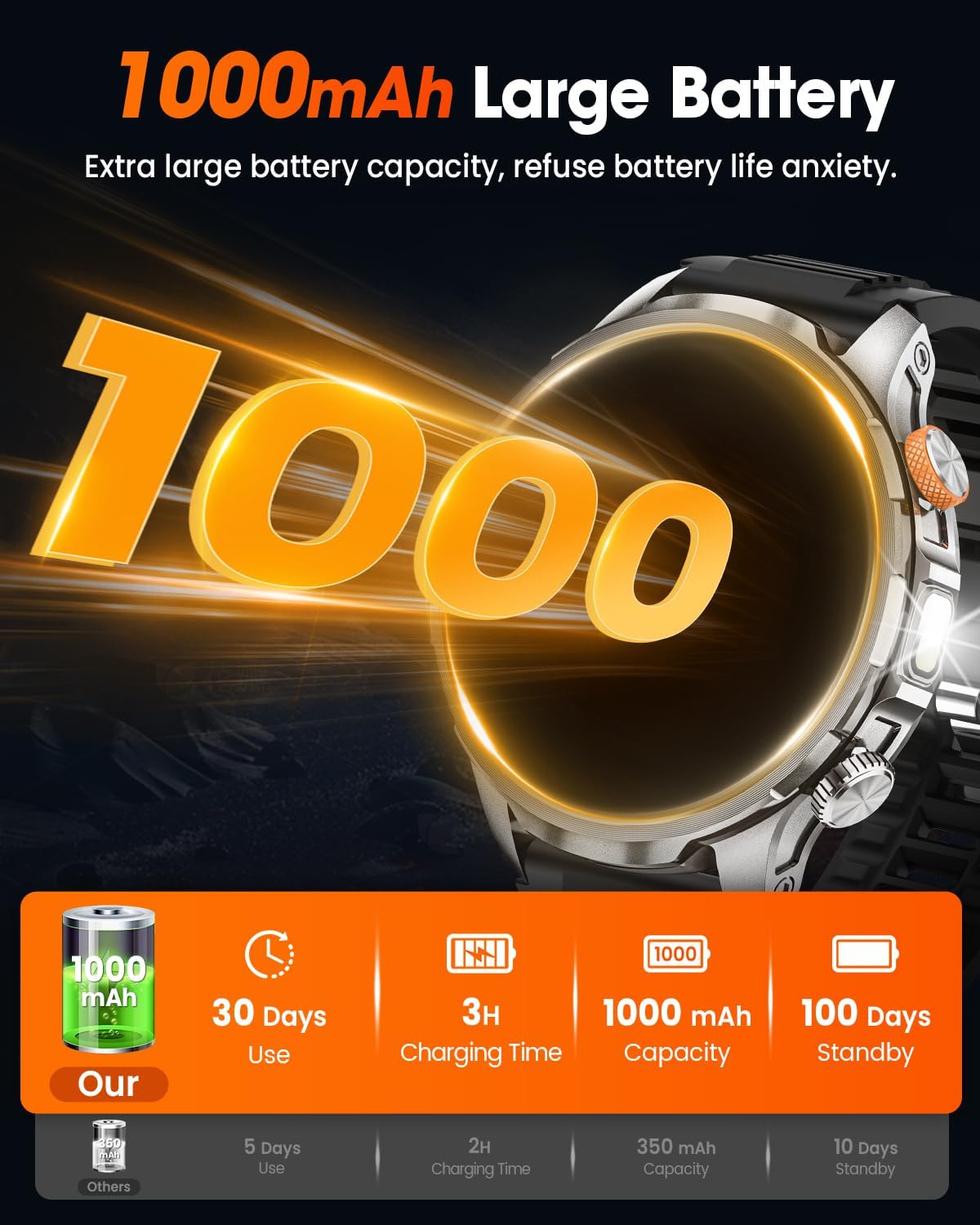 1000mAh LONG BATTERY LIFE: This military men’s smartwatch compatible with iOS and Android features a large 1000mAh battery with up to 30 days of full battery life and up to 100 days of standby time, rejecting anxiety about battery life. It is also equipped with LED side lights, which have a wide range of exposure. Whether you are looking for something in the dark or playing outdoor sports at night, you can use it as a flashlight to light it up.