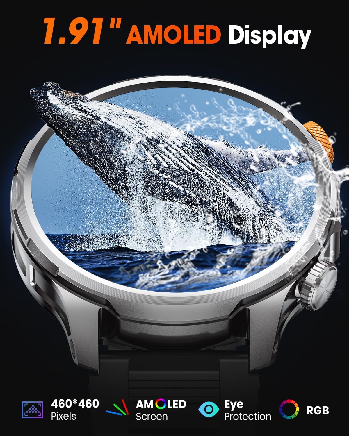 1.91″ AMOLED LARGE SCREEN: The men’s smart watch adopts 1.91 inch AMOLED full touch screen, large size display interface, 460*460 pixels brings a better visual and operating experience. Comes with two soft and skin-friendly silicone straps for you to change them. The smartwatch also comes with over 200+ online dials for you to choose from, and you can also customize the color and style of the dials to show your personality.