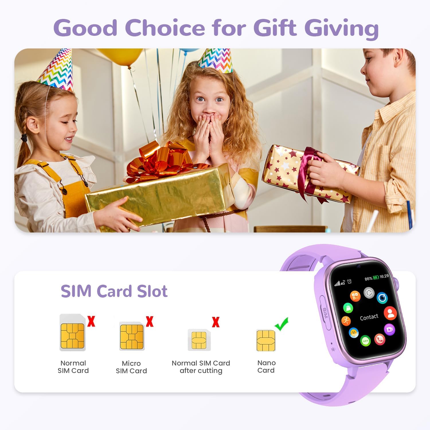 WATCH INSTRUCTIONS: Sanorum 4G kids smart watch does not contain a SIM card, please turn off the smart watch before inserting the SIM card. The steps are as follows: Insert the 4G SIM card of your Nano model in the correct orientation. Restart your child’s clock and wait for the clock signal icon to appear in the upper left corner to make and receive calls. Do not wear this smartwatch in a sauna or hot shower