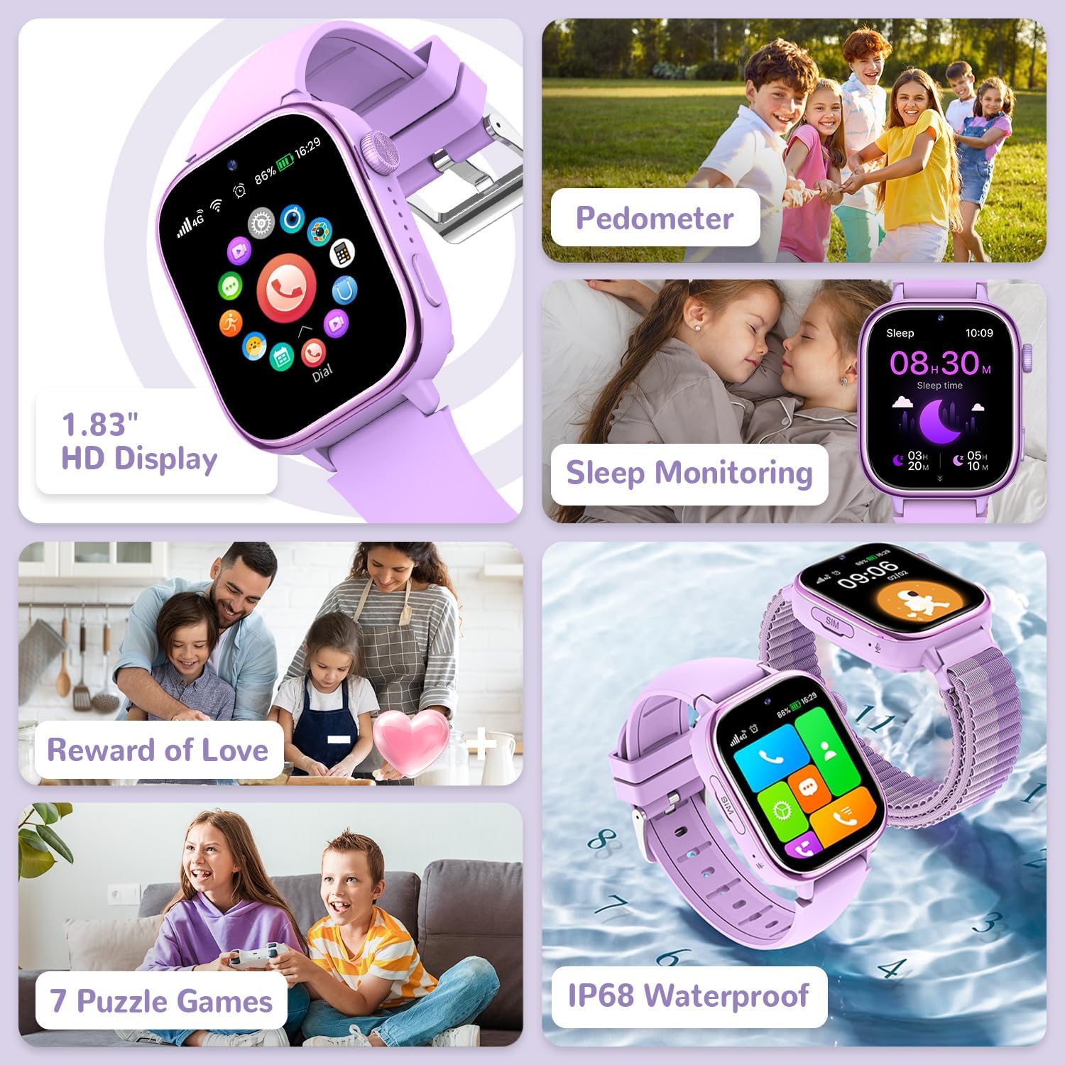 MULTIFUNCTION: The kids smart watch includes alarm, calculator, timer, pedometer, games, camera, photo album, sleep monitor, love rewards, etc.It has all the functions that children need, very practical! Its IP68 waterproof design allows children not to fear rain, sweat and daily splashes. Whether playing sports, playing games or enjoying outdoor adventures, you can use it at your whim and enjoy the fun of childhood