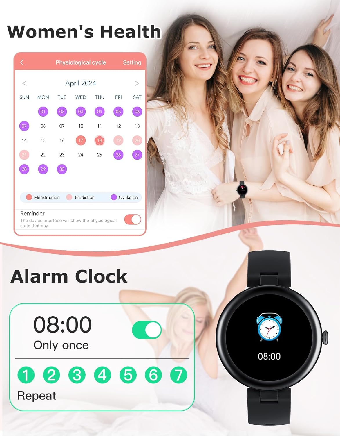 【Comprehensive Female Health Tracker】Prioritize your wellbeing. This advanced health tracker for women automatically monitors your 24/7 heart rate, blood oxygen (SpO2), and sleep quality, generating detailed sleep reports to help you build healthier habits. The dedicated period tracker function is a game-changer, providing smart reminders for your cycle, ovulation, and safe periods to help you prepare for special days and avoid embarrassment.