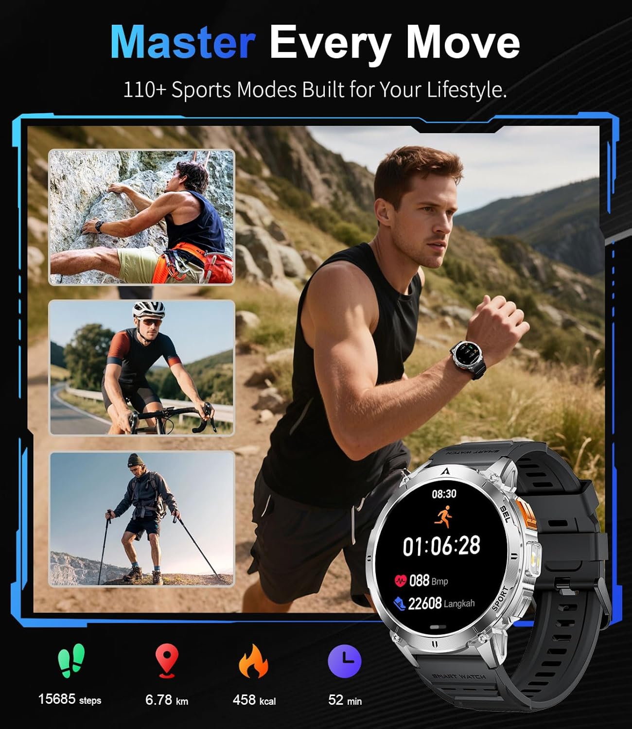 💪【Brilliant 1.56″ AMOLED Display — See Every Detail, Anywhere】2025 New Smartwatch for Men with Dual Charging CableFeaturing a vivid 1.56″ AMOLED HD display with 480×480 resolution and an ultra-bright 850 nits screen, every message, call, and health stat appears sharp and vibrant — even under direct sunlight. Whether you’re jogging outdoors or reviewing data at your desk, the high contrast and vibrant colors deliver a premium visual experience that rivals luxury smartwatches. Paired with 5ATM waterproof protection, it’s built to withstand rain, handwashing, sweat, and splashes, making it your perfect all-day companion.
