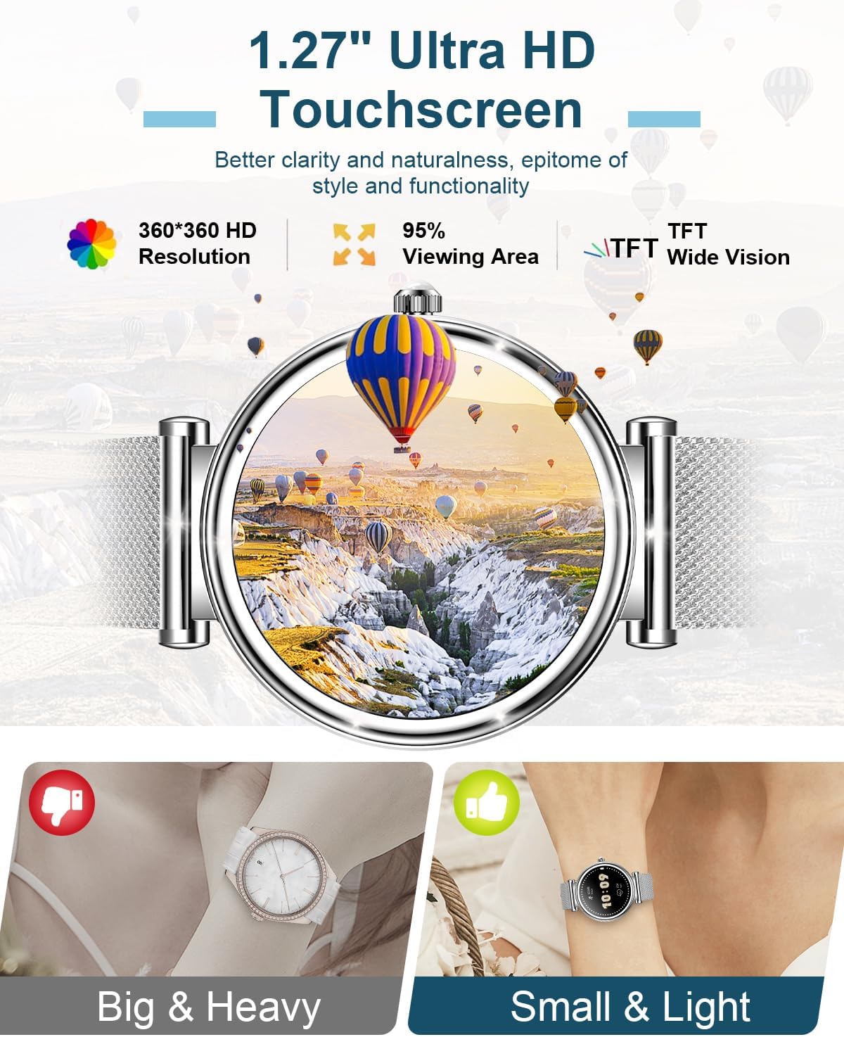 【A Great Gift for Any Occasion】This smart watches for women features a 1.27-inch full-view design with 6X screen brightness, ensuring easy readability in any environment. Elegant and sporty at the same time with many functions, make it suitable for teenagers, adults, and the elderly alike, this smart watch is a special gift for any woman men on any occasion (including Christmas, Valentine’s Day, Thanksgiving, birthdays, and more)