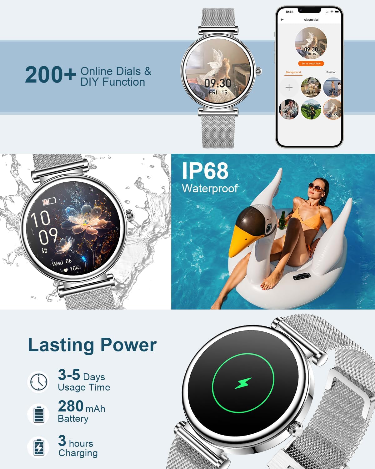 【More Chic, More Stylish】This chic smart watches for women offers over 200 stunning watch face designs, letting you switch effortlessly to match your mood and outfit. With customizable photo options, along with an elegant steel band and two soft silicone bands, it’s your perfect companion for gym sessions, weekend relaxation, or party nights. Your smart watch isn’t just an accessory – it’s a reflection of your individual style, seamlessly fitting into your life