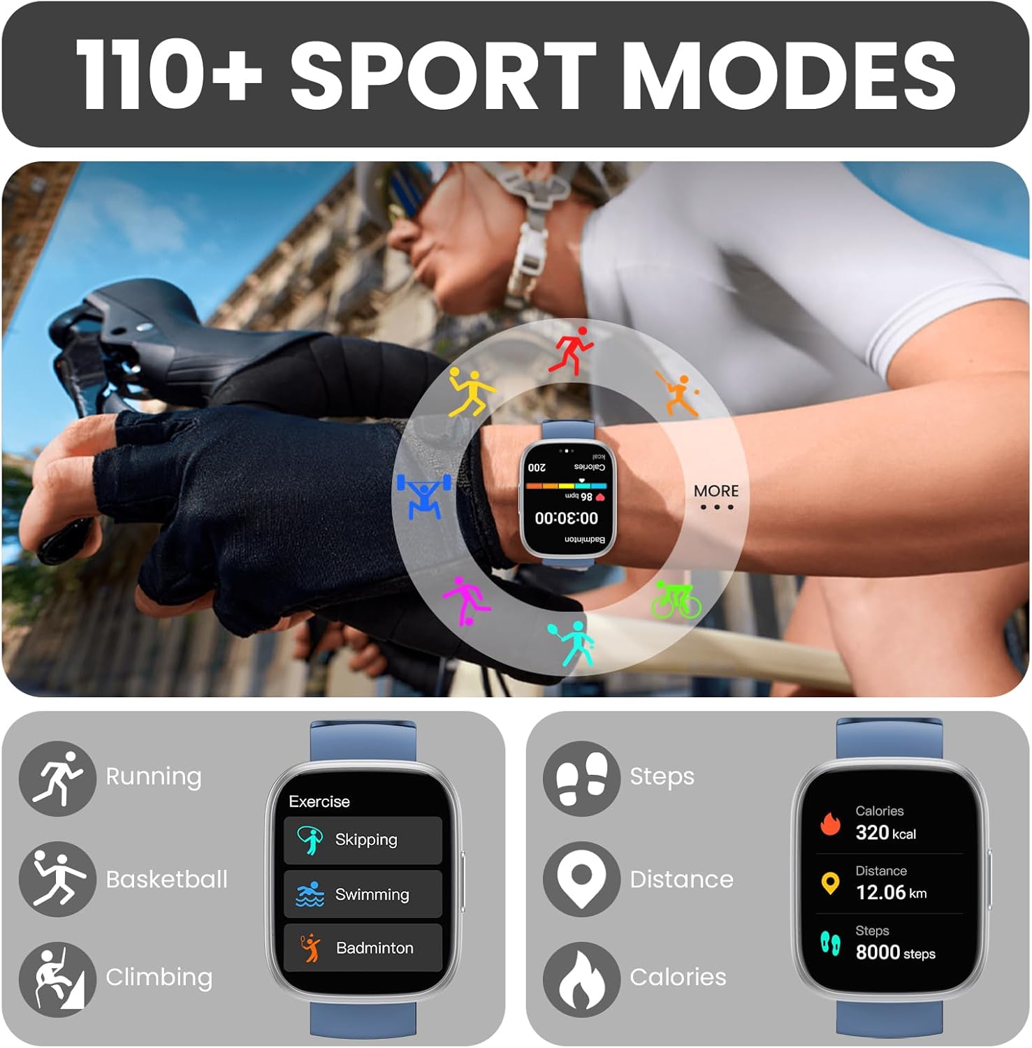 110+ Sport Modes and IP68 Waterproof: This sports smart watch supports 110+ professional sport modes, covering diverse indoor/outdoor activities like running, cycling, and soccer to suit all fitness levels. Equipped with high-precision sensors, fitness tracker watch accurately tracks steps, distance, calories burned, and workout duration to help analyze performance and optimize training plans. With an IP68 rating, it’s resistant to sweat, rain, and handwashing (Not for swimming or hot showers)