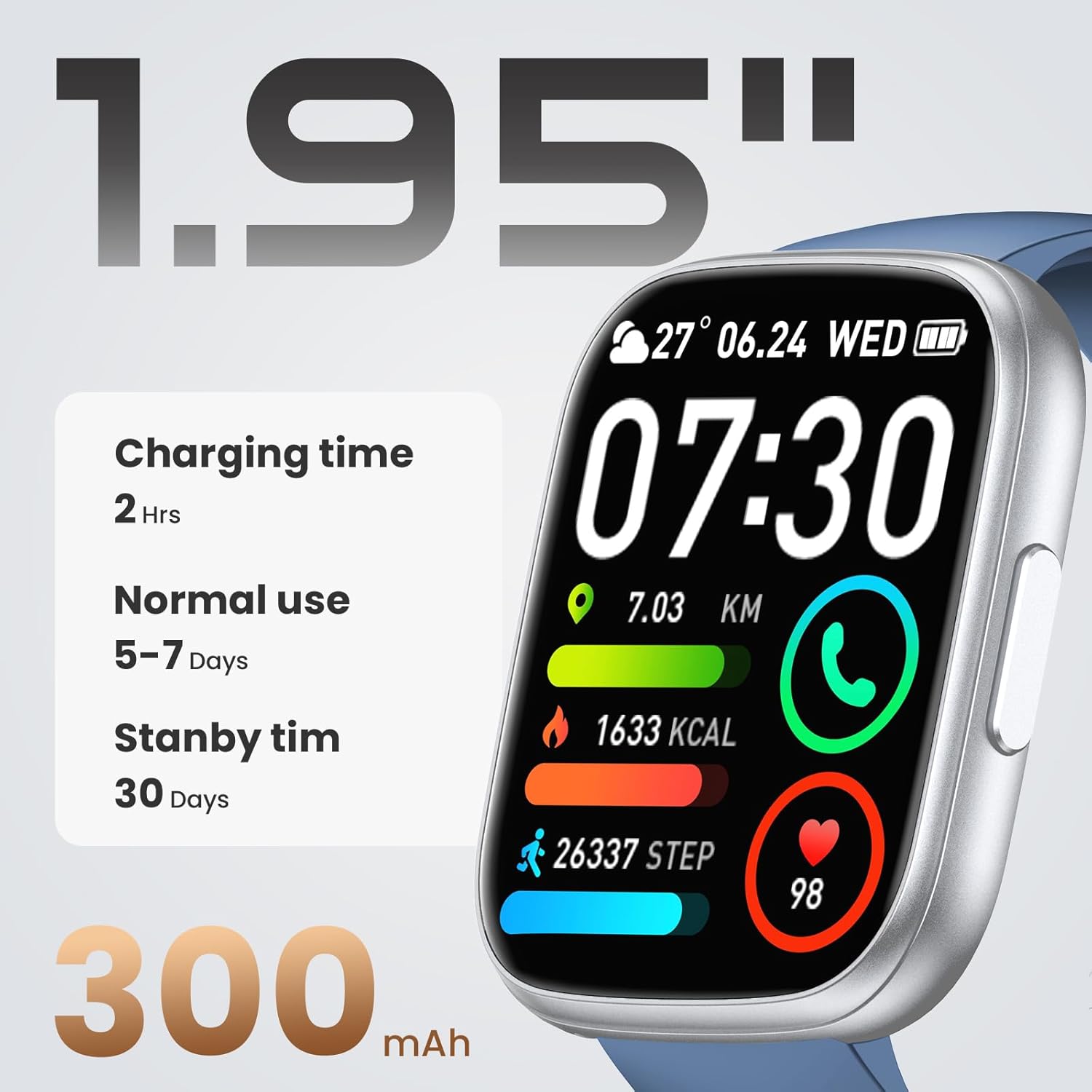 Long Battery Life and Multi-Functionality: T80 step counter watch is powered by a 300mAh battery with a low power design, providing up to 5-7 days of usage and up to 30 days of standby time, with just 1.5 hours of charging. It is widely compatible with smartphones using Bluetooth 4.0, Android 5.0, iOS 9.0, or later versions. Additionally, the waterproof pedometer watch offer various practical features, including an alarm, stopwatch, timer, find phone, camera control, weather forecast and more