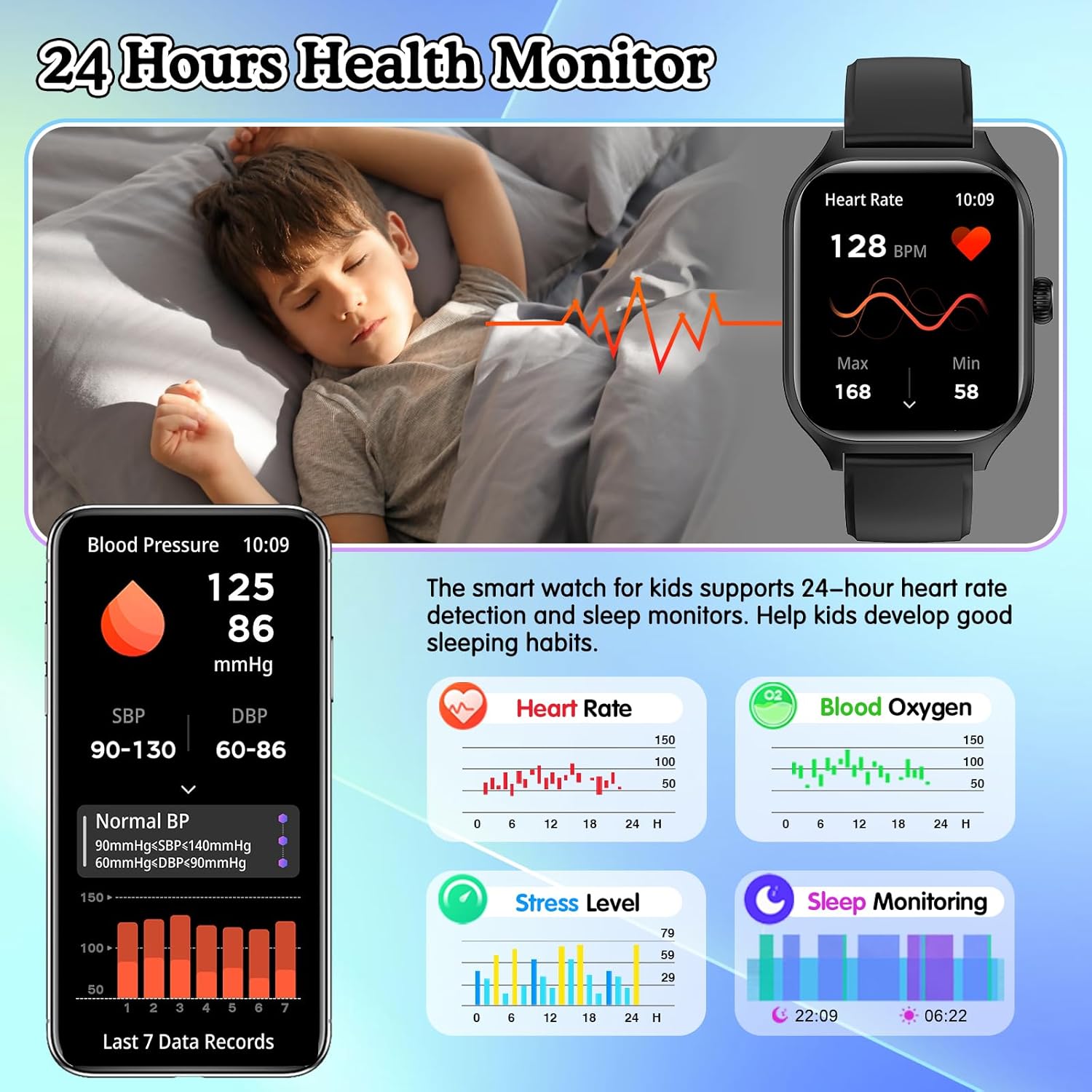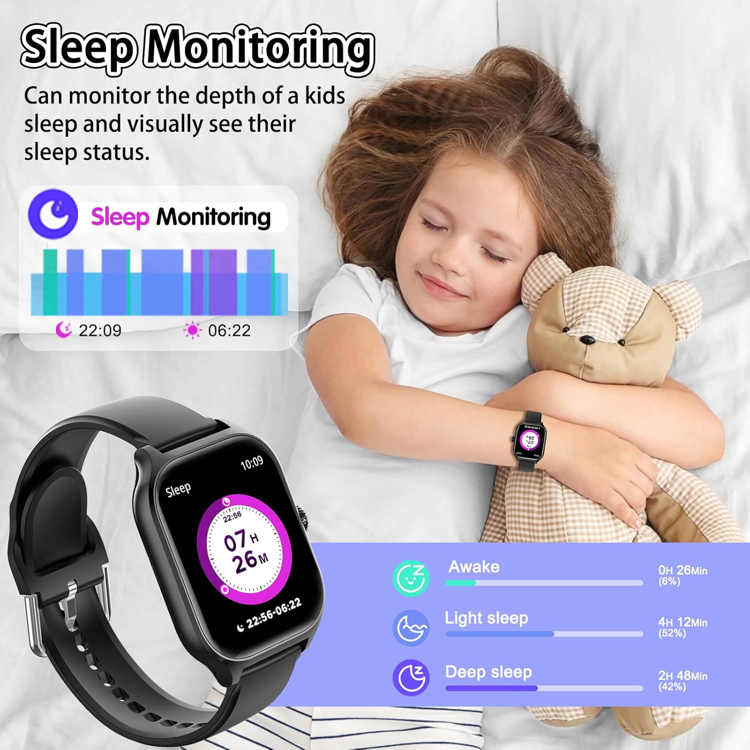 24/7 Heart Rate and Sleep Monitoring: The kids’ smartwatch supports 24-hour heart rate detection and sleep monitoring. It also records the child’s sleep (deep, light and awake). In addition, the vibration alarm can wake your child without disturbing others, helping them develop good sleeping habits. (The data is for reference only, not for medical use)