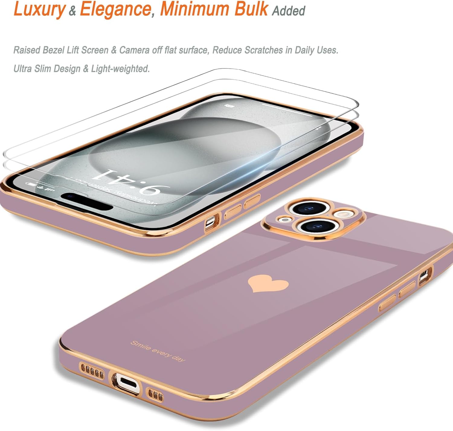 Teageo for iPhone 15 Case with 2 Screen Protector Heart Pattern for Women Girls Luxury Bling Plating…