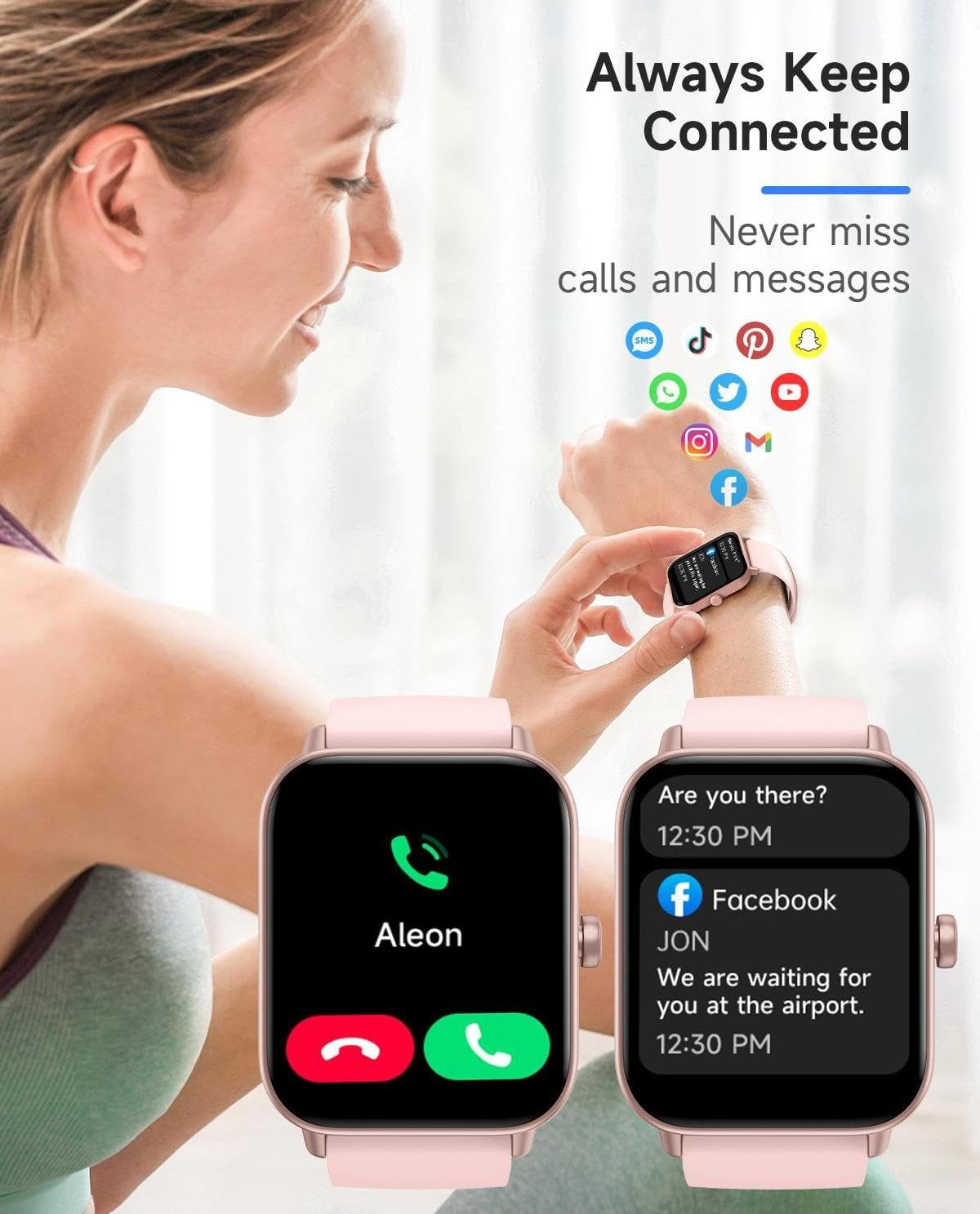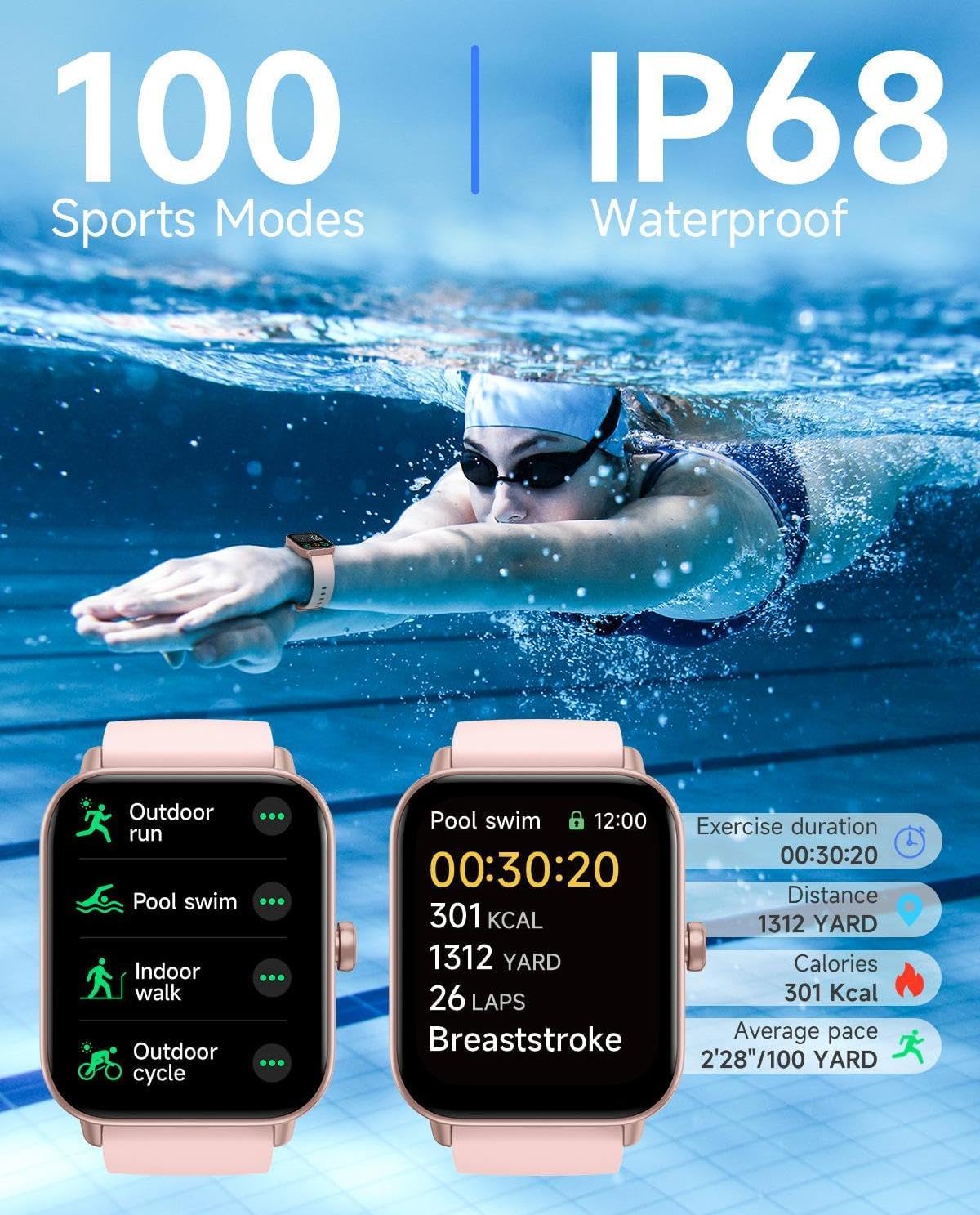 Health monitoring & Fitness Tracking: The smart watch can monitor your heart rate, and stress levels in real-time, and alert you if anything is abnormal. With over 100 different sports modes, the fitness tracker allows you to easily track your steps, calories burned, distance, speed. With maximum waterproof rating(IP68), the watch is also perfect for swimming.