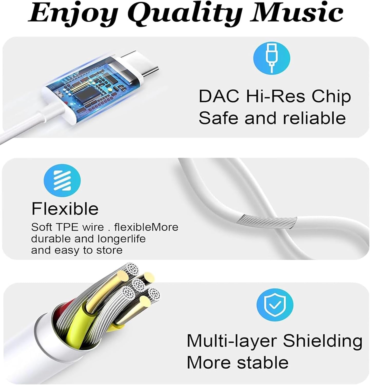 【HiFi Sound Quality】USB C headphones built-in high-quality DAC chip reduces the loss in the sound transfer.Delivers premium sound with fine-tuned acoustics that balance strong bass,soaring highs,and clear mids,you can enjoy an authentic live music experience.