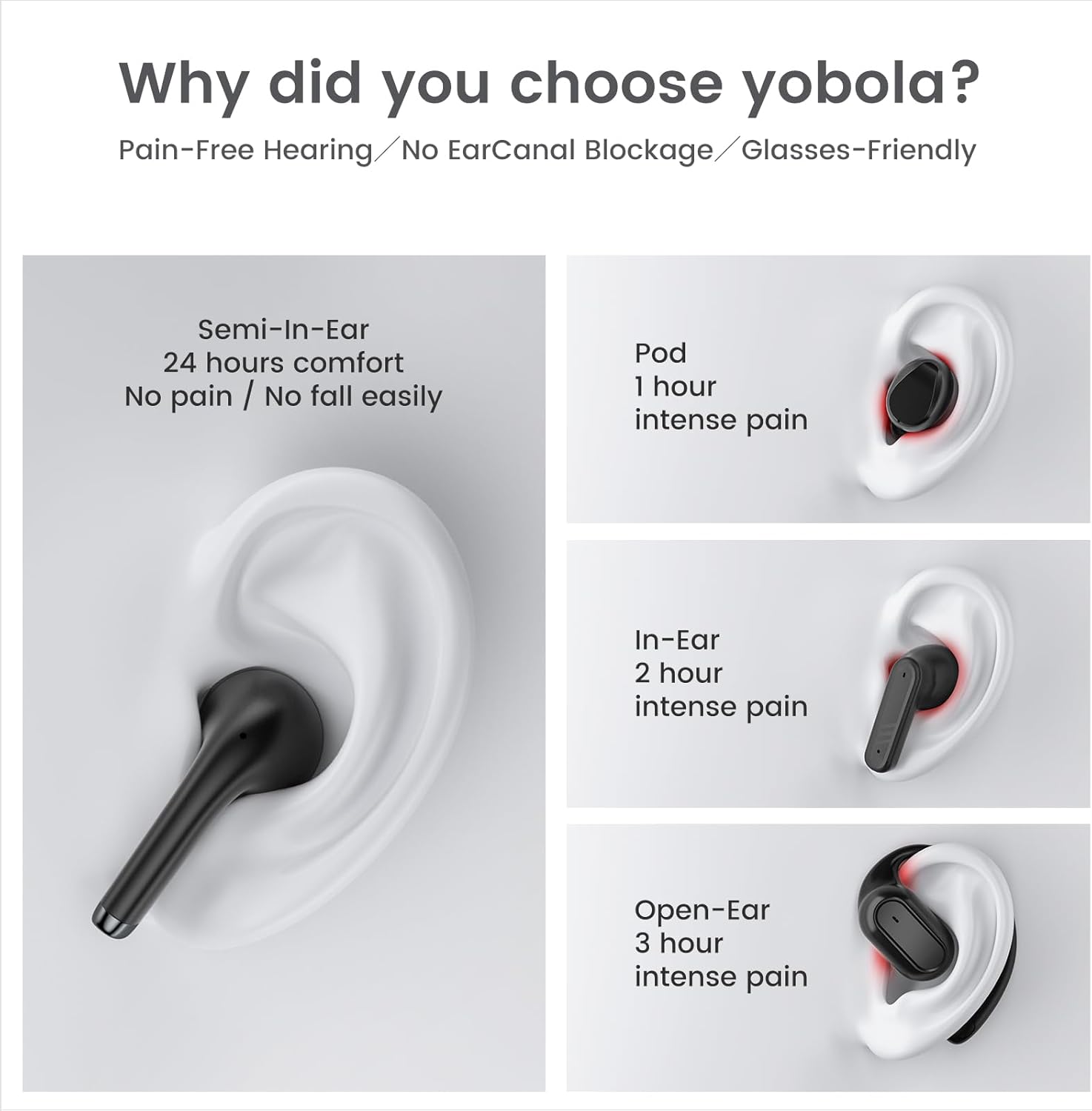 Comfort for All-Day Wear & Lightweight Fit: yobola wireless earbuds bluetooth are ergonomically designed, mini and lightweight, so you can hardly feel their presence. They are also equipped with S/M safety-grade silicone ear caps, which fit the ear contour perfectly, causing no pain or ear canal obstruction. They stay firmly in place and are not easy to fall off. Whether you’re commuting, working, or running, you can enjoy a comfortable and burden-free listening experience all day long.