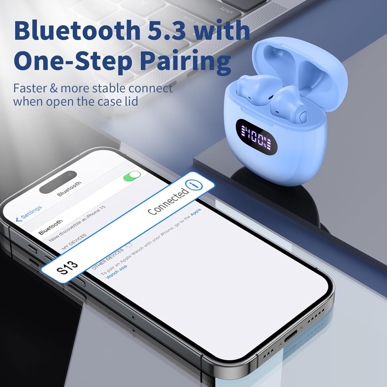 【Bluetooth 5.3 & One-Step Pairing】 Built in the latest Bluetooth 5.3 chipset, the Bluetooth earbuds having a faster and more stable Bluetooth transmission, which achieved low latency. No need to worry about interruption when use the Bluetooth ear buds to listen to music, watch movie, havE phonecalls and online video call.
